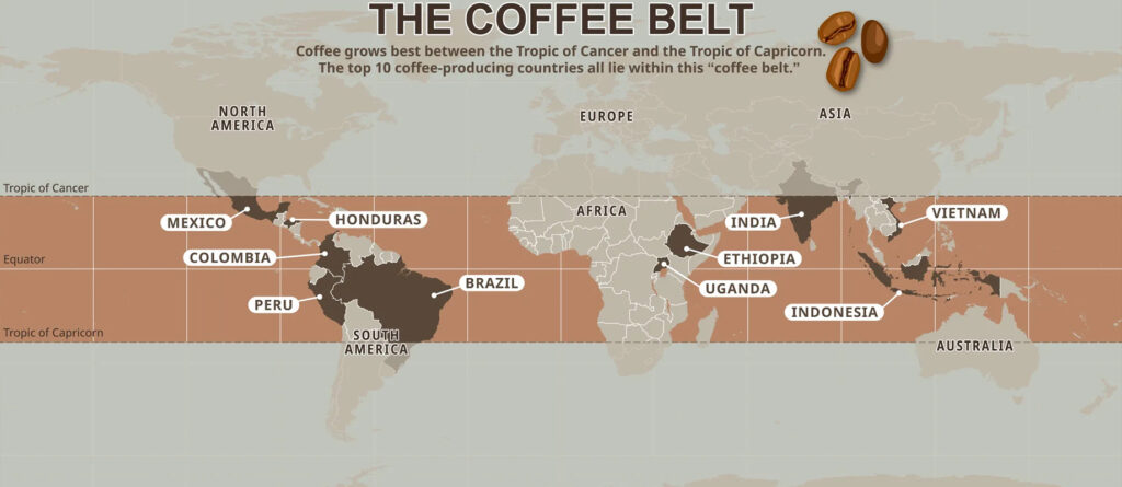 Every cup of coffee starts on a farm, often on small plots of land passed down through generations. Coffee grows best in what we call the Coffee Belt — a tropical zone between the Tropics of Cancer and Capricorn. Countries like Ethiopia, Colombia, Brazil, Kenya, and Panama are famous for producing some of the world’s finest beans.